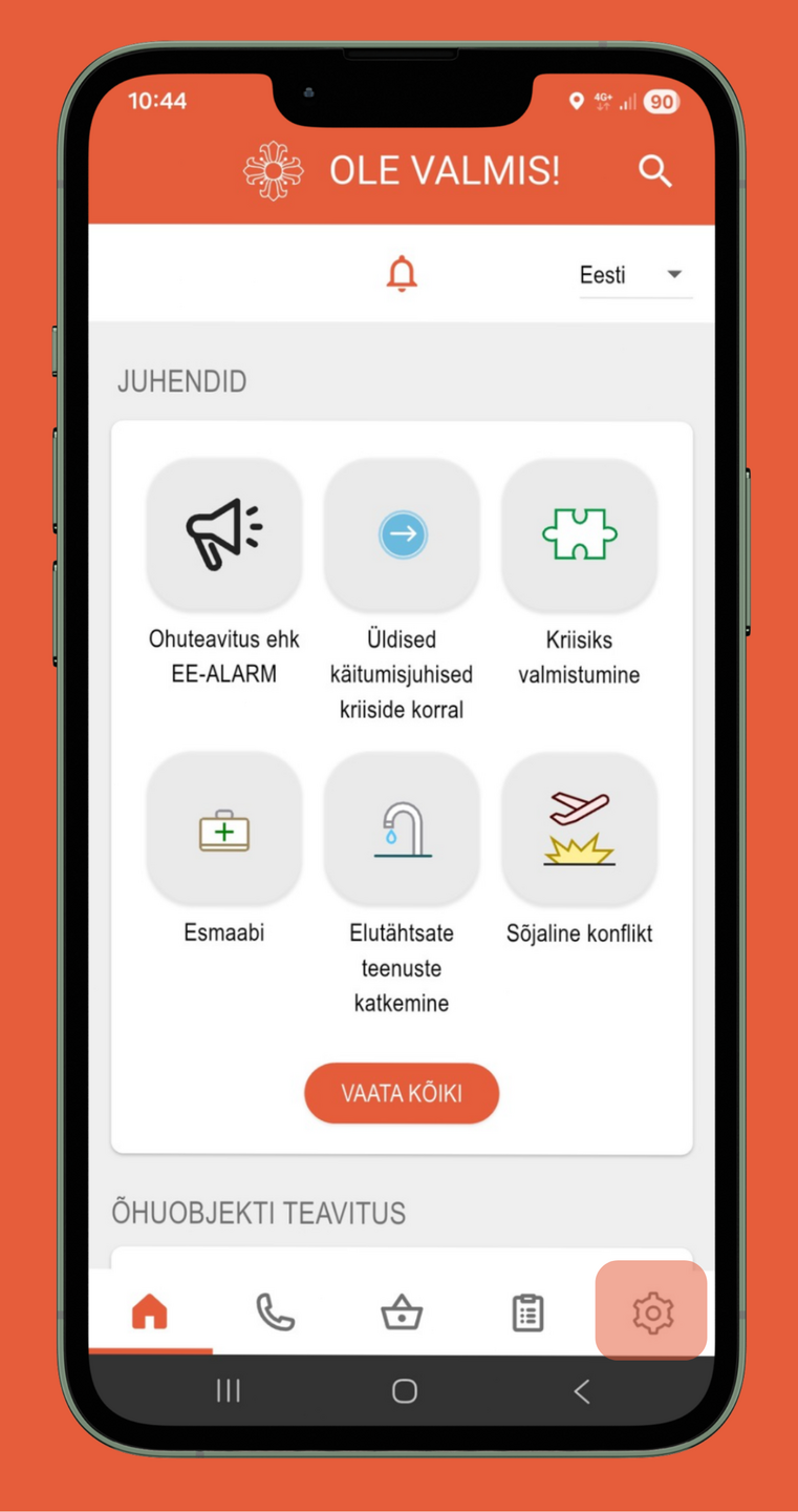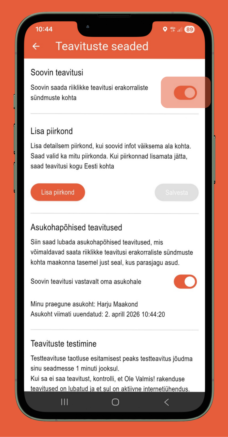 Selleks, et saada ohuteavitusi "Ole valmis!" äpi kaudu, peavad "Ole valmis!" äpi teavitused olema sisse lülitatud. Seda saab kontrollida nii: