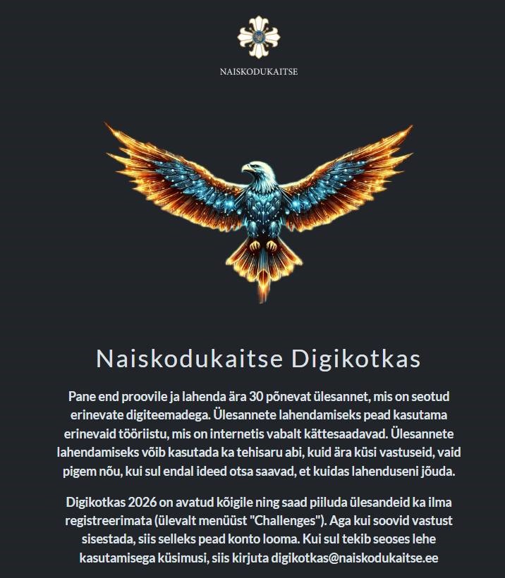 Naiskodukaitse kutsub turvalise interneti Veebruar on rahvusvaheliselt turvalise interneti kuu, mille eesmärk on juhtida tähelepanu teadlikule, vastutustundlikule ja turvalisele tegutsemisele digikeskkonnas. Sel puhul kutsub Naiskodukaitse kõiki huvilisi osalema Digikotka veebiväljakutses, mis aitab arendada oma praktilisi digioskusi. ← Eelmine Digikotkas 2026 arendas digipädevusi üle Eesti Naiskodukaitse kutsub turvalise interneti kuu puhul Digikotka väljakutsele Digikotkas on veebipõhine digipädevuste võistlus- ja õpikeskkond, kus osalejad lahendavad ülesandeid, mis on seotud infootsingu, digiturvalisuse, loogilise mõtlemise ja teadliku küberkäitumisega. Osalemine ei eelda erialast IT-tausta - oluline on huvi õppida ja valmisolek mõelda.