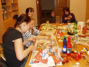 Kaks kärbest ühe hoobiga Naiskodukaitse Rapla jaoskonna novembrikuine naisteõhtu toimus 13. novembril. Sedakorda olid teemaks jälle taaskasutus ja isetegemine. 2012 ← Eelmine Raplas peeti teistmoodi koosolekut Järgmine → Raplast oma poistele – südamega Kaks kärbest ühe hoobiga ja ilu rohkem kui rubla eest Rapla jaoskond on oma naisteõhtutega ilmselgelt eesmärgiks võtnud maailma ilusamaks paigaks muutmise. Novembris võeti lausa nii suurelt ette, et tehti midagi ilusat koju ja midagi ilusat ka endale külge riputamiseks Algab ju maailma kaunimaks muutmine ikka iseendast ja oma kodust:). Kodu kaunimaks muutmiseks õpiti salvräti- ehk decoupage-tehnikat, millega saab uue näo anda erinevatele nõudele, potsikutele, totsikutele, peeglitele ja isegi mööblile. Tegelikult on decoupagetehnika kasutamisel piiriks ainult iseenda fantaasia ja poekettide salvrätivalik, sest nagu jutu käigus välja tuli, olla kauneid salvrätipilte isegi kummikutel nähtud. | ||