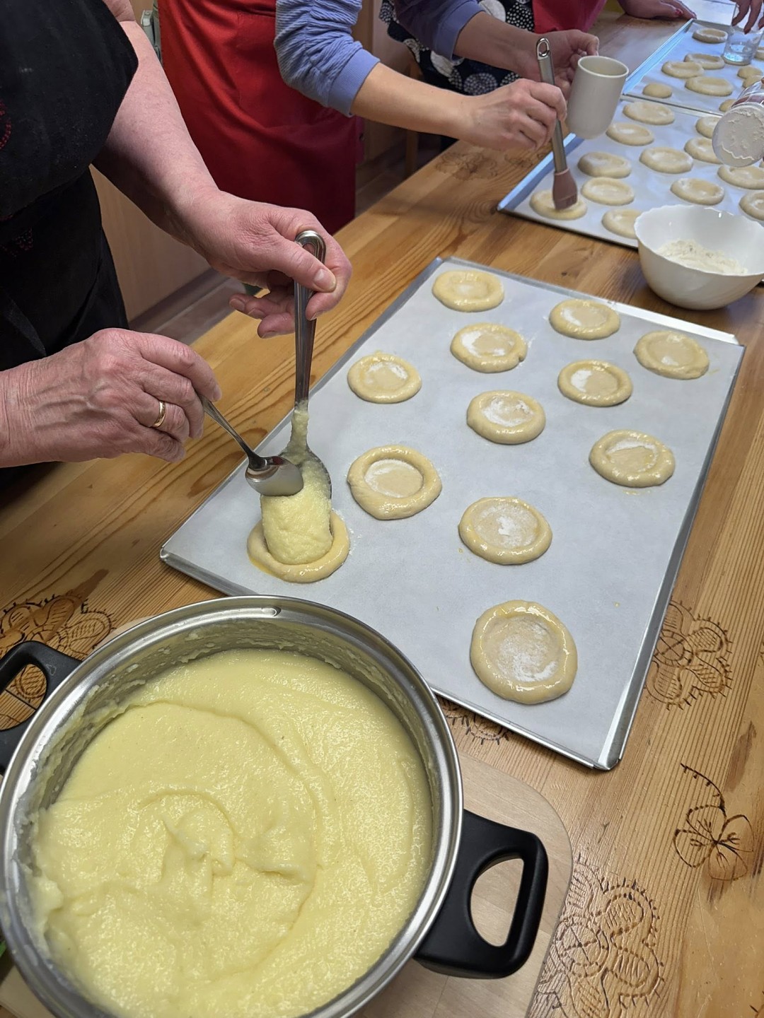 Vahepeal kerkinud kuklitest vormiti “kausikesed”, kuhu tõsteti mehised lusikatäied valmis podisenud kollast mannaputru. Seejärel rändasid kuklid ahju küpsema. | ||
