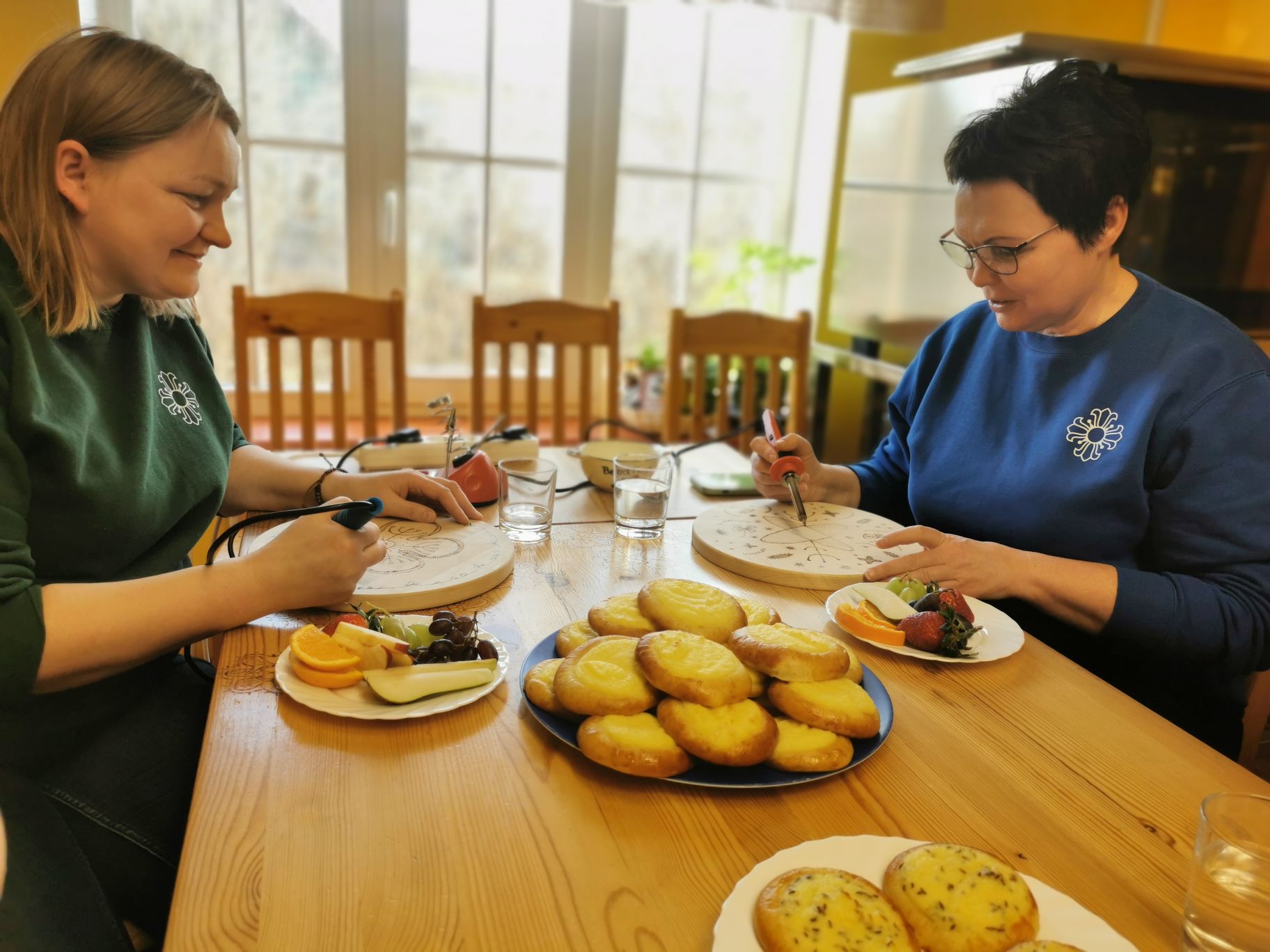 Seekord mahtus peoplaanidesse päevakeskuse toredate juhendajate Mari ja Ivi juhendamisel kaks vahvat ühistegevust: puidust lõikelauale mustrite põletamine ning traditsiooniliste Mulgi korpide küpsetamine. Nii mõnigi nentis, et pole suurem asi joonistaja ning pliiatsi asemel kuuma põleti peos hoidmine tundus pelutav. Pärast proovitööd aga hirmud kadusid ning laua ümber keerles rahulolev tegutsemisnohin ja puidu põlemise lõhn. Laudadele ilmusid riburada pidi erinevad kaitsesümbolid. Kohe kuidagi ei raatsinud põletit käest panna, kuid kõrvaltoas kausis kerkiv taigen ootas hellasid ja tegutsevaid käsi. | ||