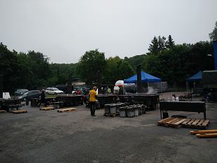 Ja kui survest rääkida, siis esimesel päeval tundus terve katel, kui tuumarakett – tuled, kellad (otseses mõttes). No tagatuled peavad ju ikka olema igal järelkärul, isegi siis, kui see aeg-ajalt välikatlaks moondub. Ajab vammused seljast, korstnad sirgu, tarvikute kapid pealt maha kõrvale seisma, kolib ratastelt jalgadele ja ongi neljakandilisest ilmetust kastist saanud edevalt läikiv toidukeetmise koht. Kellad – põleti rõhunäidik, katelt ümbritseva õli temperatuuri näidik. Kolmandaks päevaks sai juba enam-vähem pihta, mis miski on ja muide iga asi täitsa vajalik, et kõik töökorras oleks. Kui rootsi katlaga oli asi lihtne – elav tuli puudega katlale alla, pottidesse vesi ja vaaritamine võis alata, siis hollandi katlal oli see eripära, et katelt ümbritseb nn õlisärk, mida põleti altpoolt kuumutab. See võimaldab üles soojendada suurema keedupinna, sest õli temperatuur võib tõusta päris kõrgele. Samas peab ka jälgima, et õli temperatuur liiga kõrgele ei tõuseks ja selleks on kahe katla vahel piklikud veevannid, mis jahutavad õli (vesi üle 1000C ei tõuse).  Tulles nüüd tagasi jutu alguses mainitud nuppude juurde, siis oli lisaks katlapottide nuppudele veel 2 veevanni nuppu, mida vahetpidamata lahti-kinni kruttida, sest kogu aeg oli vaja vaadata, ega jahutusvesi pole kriitilisest piirist allapoole langenud, st ära auranud.