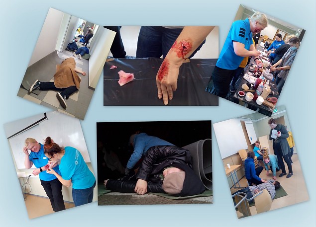 “Oih, see minestas nüüd ka ära - ma vist parem lähen siit minema…" Kui kannatanud kõik ära kukuvad ning abistajad hakkavad samuti järgemööda minestama, siis mida teha? Kas enne peab tegelema peahaavaga kannatanuga või sellega, kes nurgas tudiseb? Nendele ja paljudele teistele küsimustele otsisid õppurid vastuseid 26. märtsil toimunud meditsiini erialagrupi täiendõppel, mille käigus õpiti kannatanutele grimmi tegema ja situatsioone lahendama. Kogenud instruktorid andsid näpunäiteid nii usutava kannatamise kui ka efektiivse abistamise osas. Muuhulgas said õppurid teada, mis tunne on olla eluruumist jalgupidi välja lohistatud, kui raske on omal jalal liikuvaid kannatanuid ühes pundis hoida ning palju muudki vajalikku. NB! Õppuse käigus ei vigastatud reaalselt ühtki osalejat! |