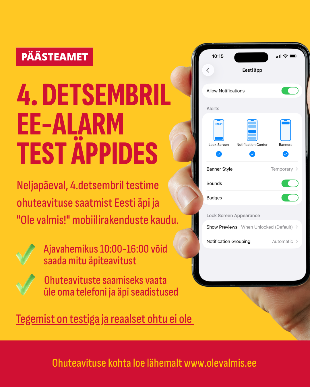 Päästeamet saadab koostöös Riigi Infosüsteemi Ameti (RIA) ja Naiskodukaitsega neljapäeval, 4. detsembril vahemikus 10.00-16.00 üle Eesti testteavitused Eesti äpi ja “Ole valmis!” mobiilirakenduse kaudu. Testimise ajal võivad äppide kasutajad saada mitu testteavitust. Testimise eesmärk on kontrollida äppide toimimist riikliku ohuteavitussüsteemi osana ning valmistuda 10. detsembril toimuvaks üleriigiliseks ohuteavitussüsteemi testimiseks.