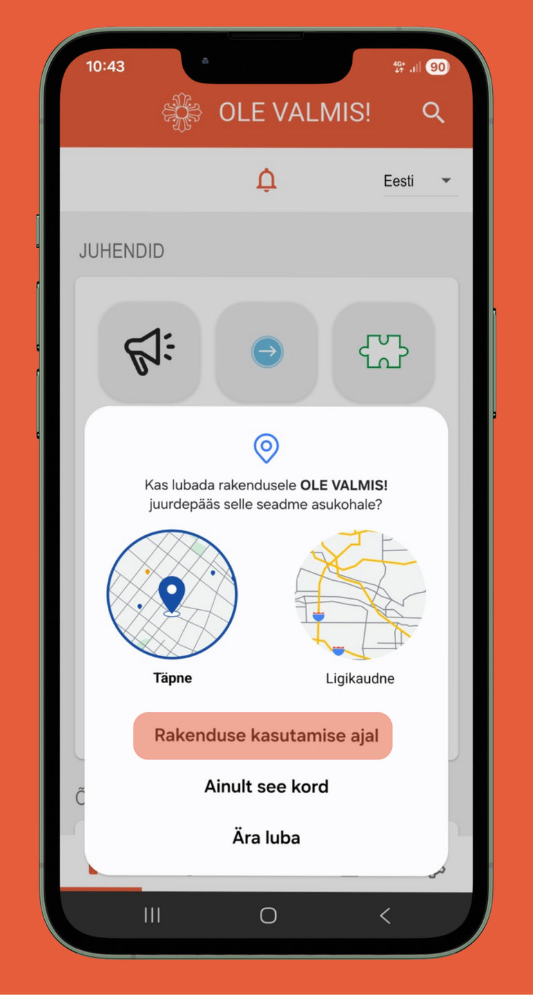 "Ole valmis!" äpi alla laadimise järel tuleb see vähemalt korra avada ning anda seadmele vajalikud õigused - anda luba saata teile märguandeid (1. pilt) ja lubada rakendusele juurdepääs seadme asukohale (2. ja 3. pilt). |