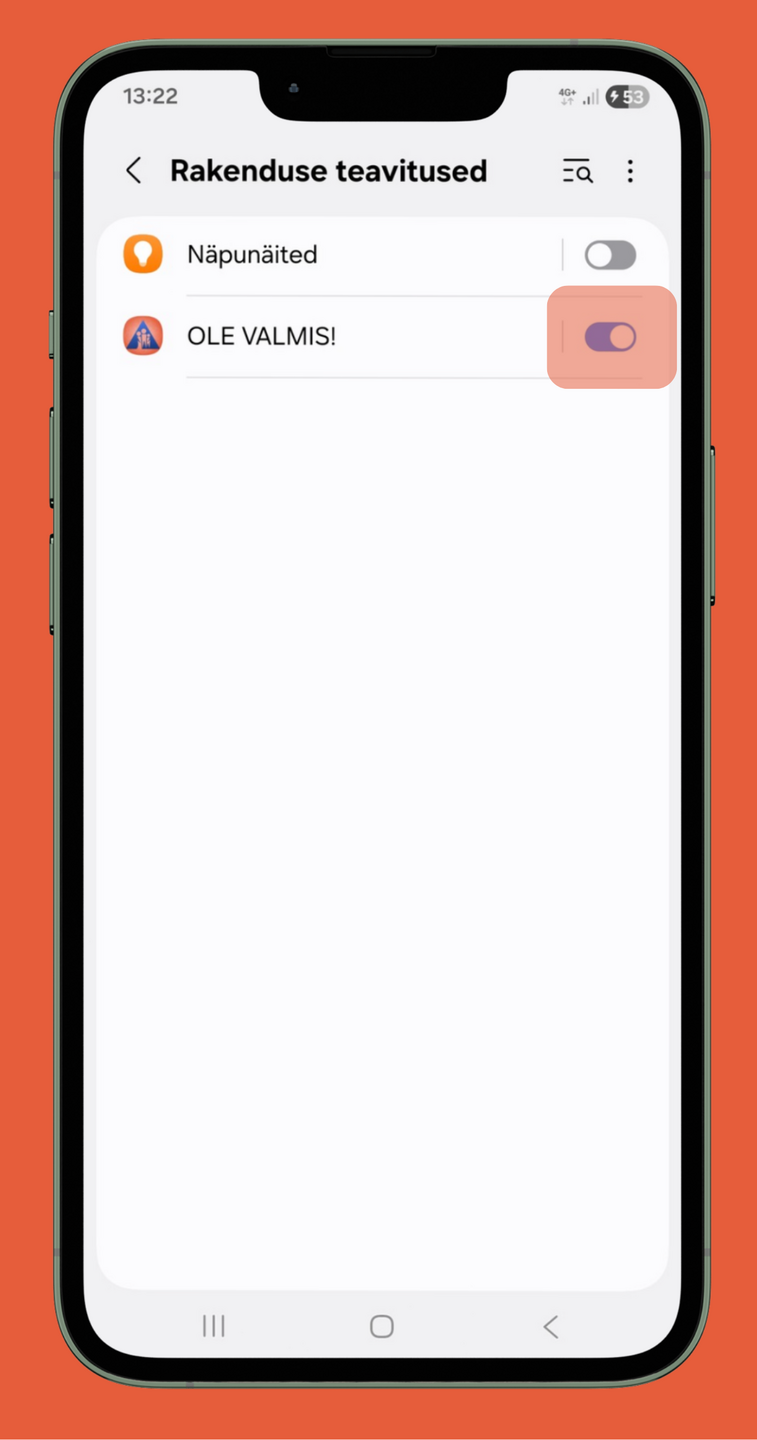 Selleks, et saada ohuteavitusi "Ole valmis!" äpi kaudu, peavad "Ole valmis!" äpi teavitused olema sisse lülitatud. Seda saab kontrollida nii: 1. Ava Seaded (Settings) -> Teavitused (Notifications) -> Rakenduse teavitused (App notifications) -> "OLE VALMIS!". 2. Avaneval lehel veendu, et "Teavituste lubamine" oleks sisse lülitatud. Heliga teavituse saamiseks peab olema ka järgmine nupp "Heli ja värin" sisse lülitatud (vt allolevaid pilte). 3. Võiks olla lubatud ka teavitused "Luk-ekraan" (ehk lukustusekraanil) ning "Teavituse hüpik".